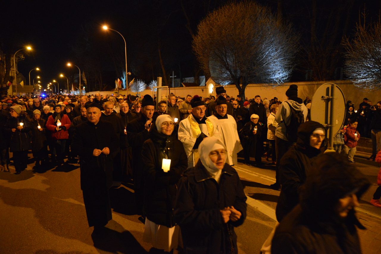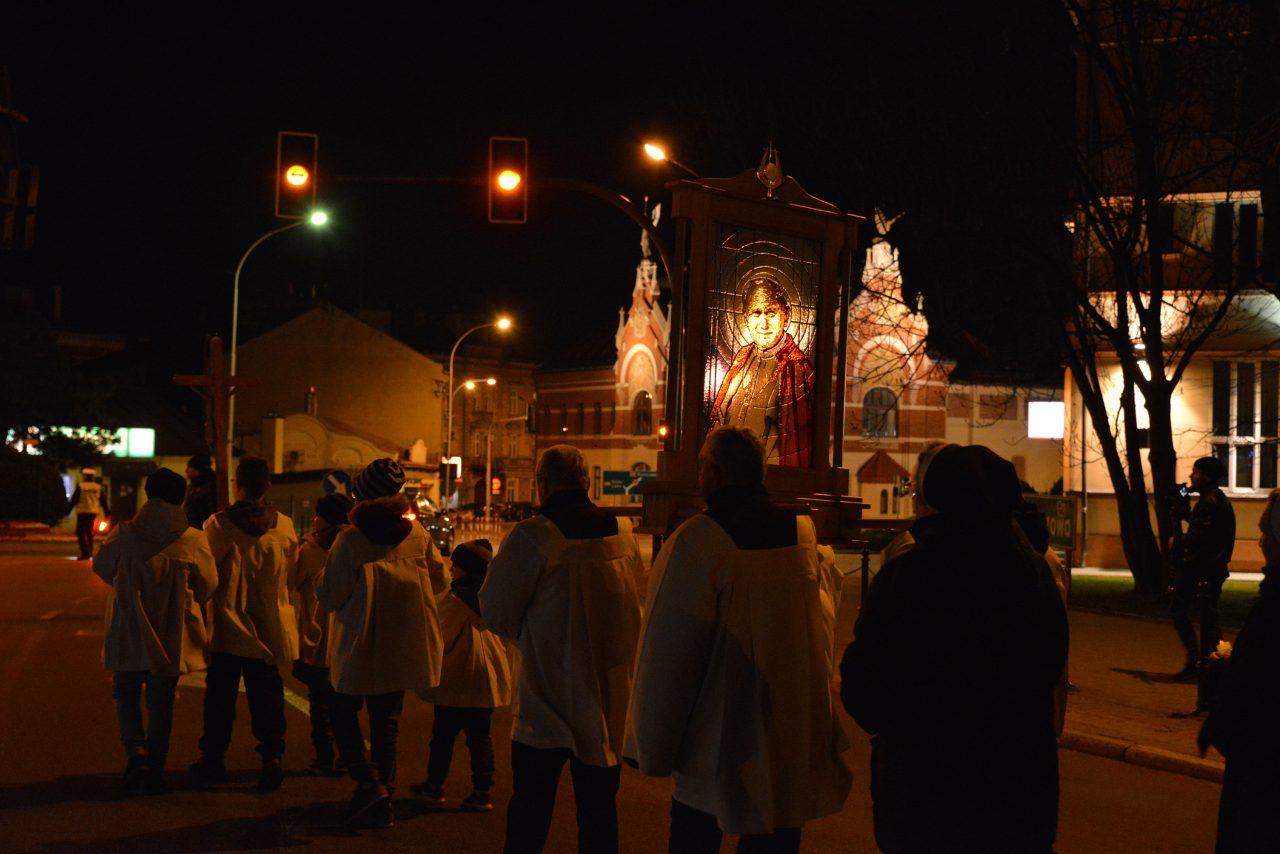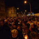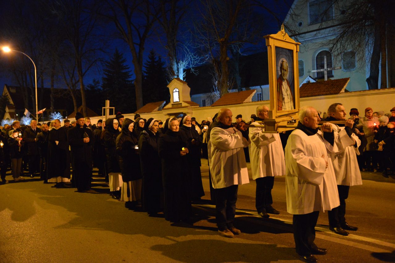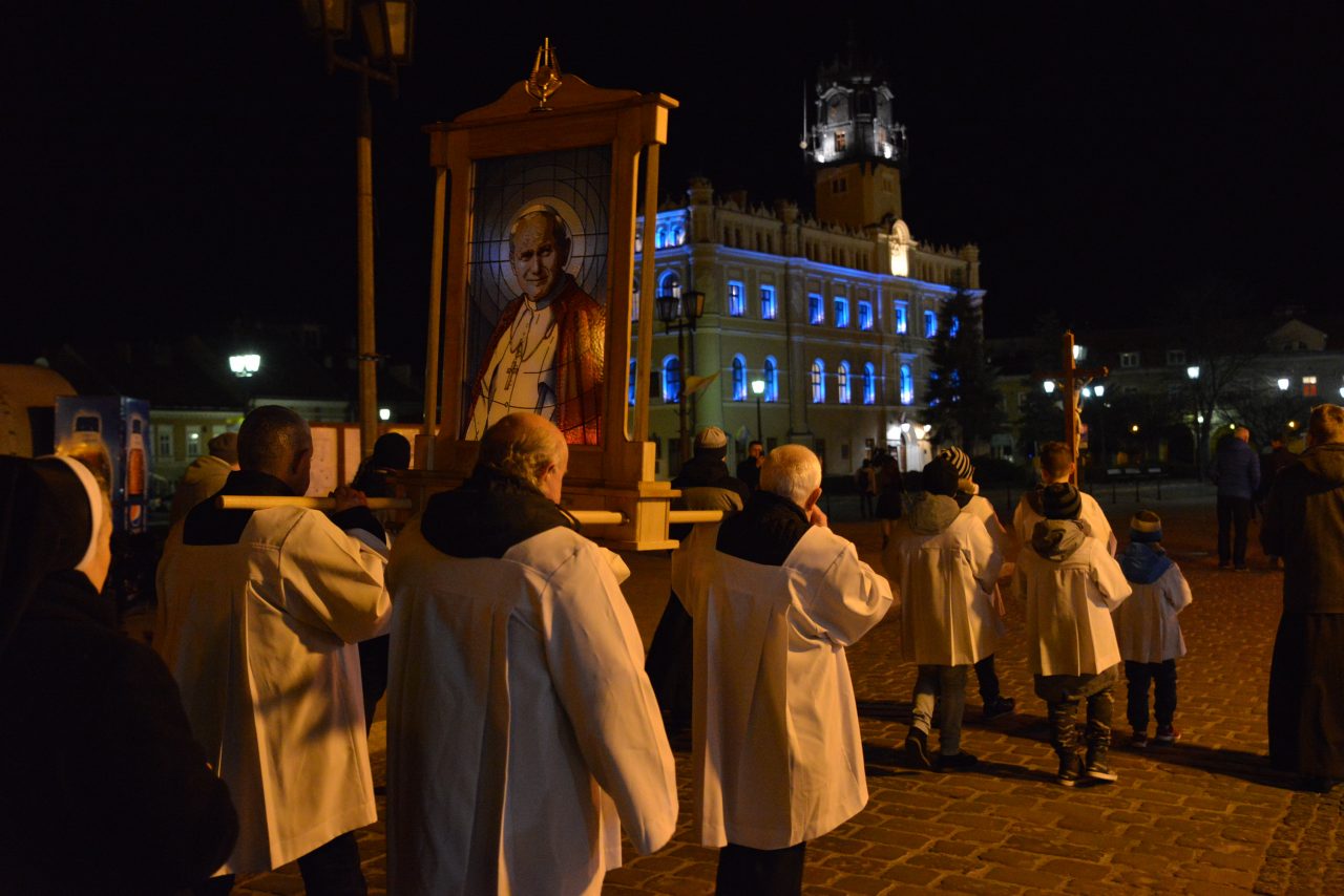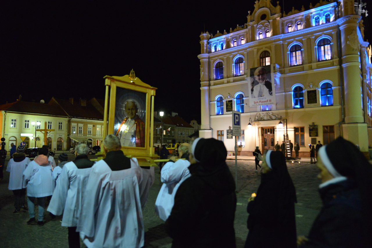 Nabożeństwo Światła z relikwiami Św. Jana Pawła II obejmowało rozważanie tajemnic światła Różańca Świętego przez duszpasterzy jarosławskich parafii, siostry zakonne oraz zgromadzonych podczas przemarszu, który wyruszył o godz. 20:00 sprzed kościoła oo. Franciszkanów na jarosławski Rynek. Hołd Największemu Polakowi złożyła w tym roku wyjątkowo imponująca liczba uczestników.