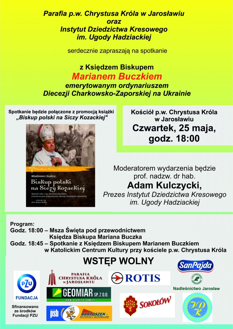 Spotkanie z księdzem biskupem Marianem Buczkiem odbyło się w Katolickim Centrum Kultury przy kościele pod wezwaniem Chrystusa Króla w Jarosławiu. Spotkanie połączone było z promocją książki „Biskup polski na Siczy Kozackiej”, która ukazuje w szerokim aspekcie posługę księdza biskupa na Ukrainie. Moderatorem wydarzenia był niekwestionowany specjalista tematyki polsko-ukraińskiej prof. nadzw. dr hab. Adam Kulczycki, prezes Instytut Dziedzictwa Kresowego im. Ugody Hadziackiej.