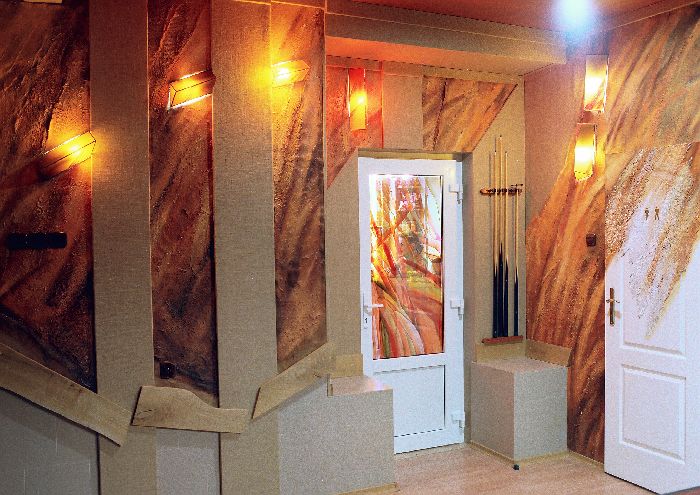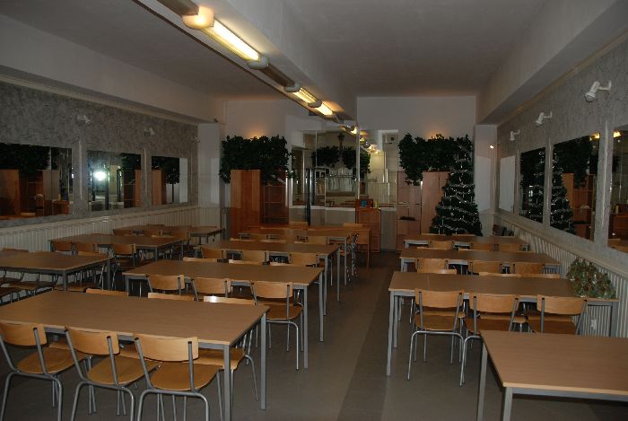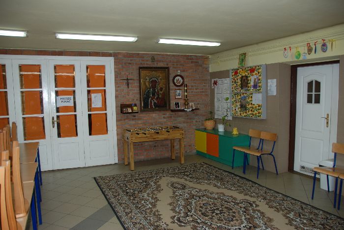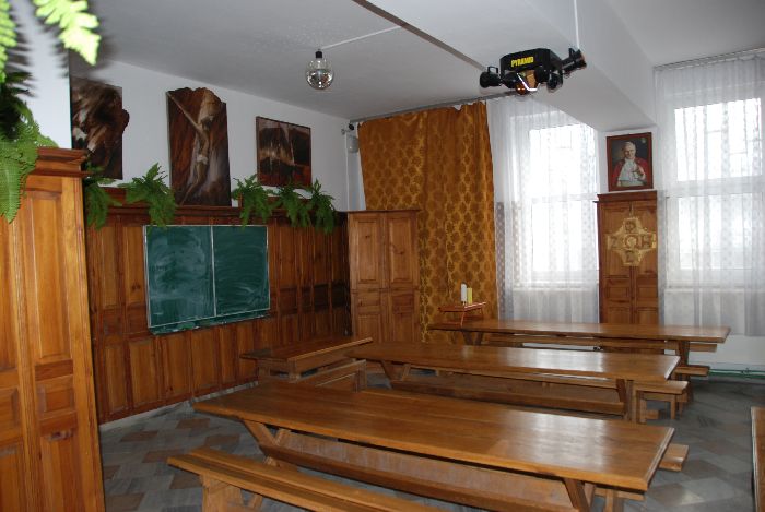 z małym barkiem, światłami typu dyskotekowego i sprzętem audiowizualnym (zamiast krzeseł ławy i stoły dębowe)